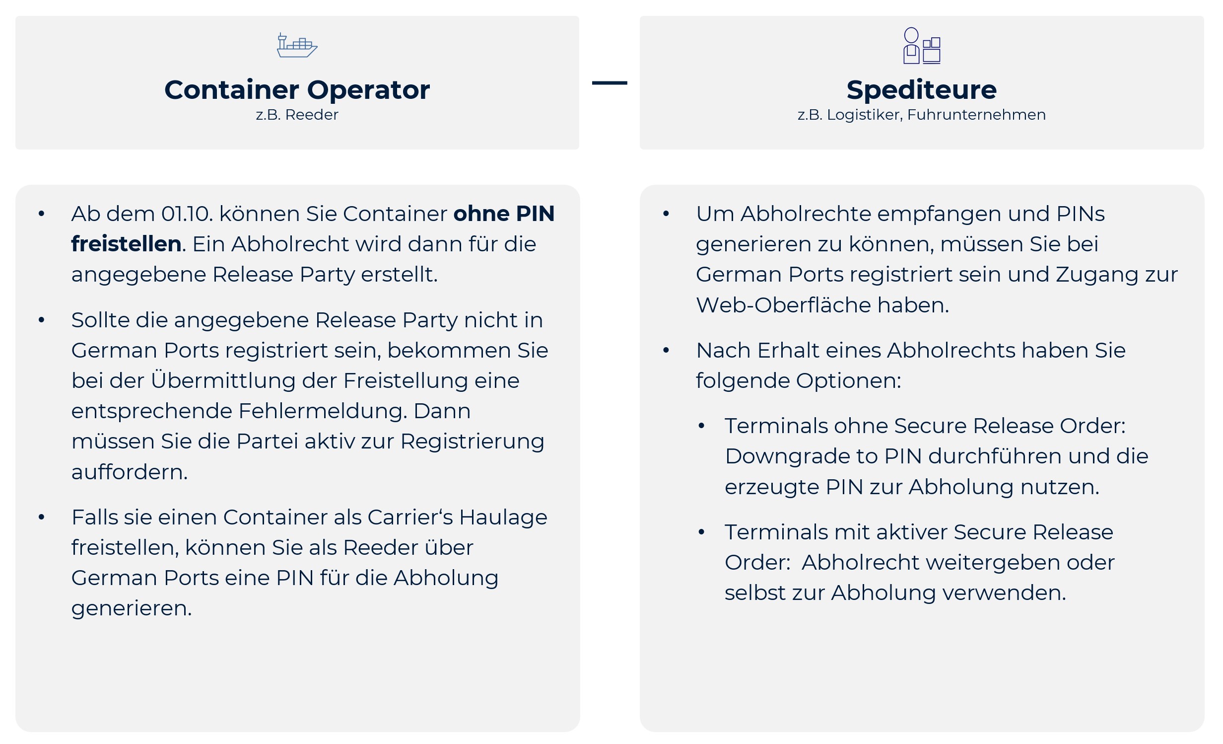 Am 01. Oktober 2025 wird der Secure Release Order Prozess mit den Reedern gestartet. Für alle weiteren Prozessbeteiligten bleibt übergangsweise ein „Downgrade to PIN“ möglich, sodass weiterhin der PIN-basierte Prozess genutzt werden kann.