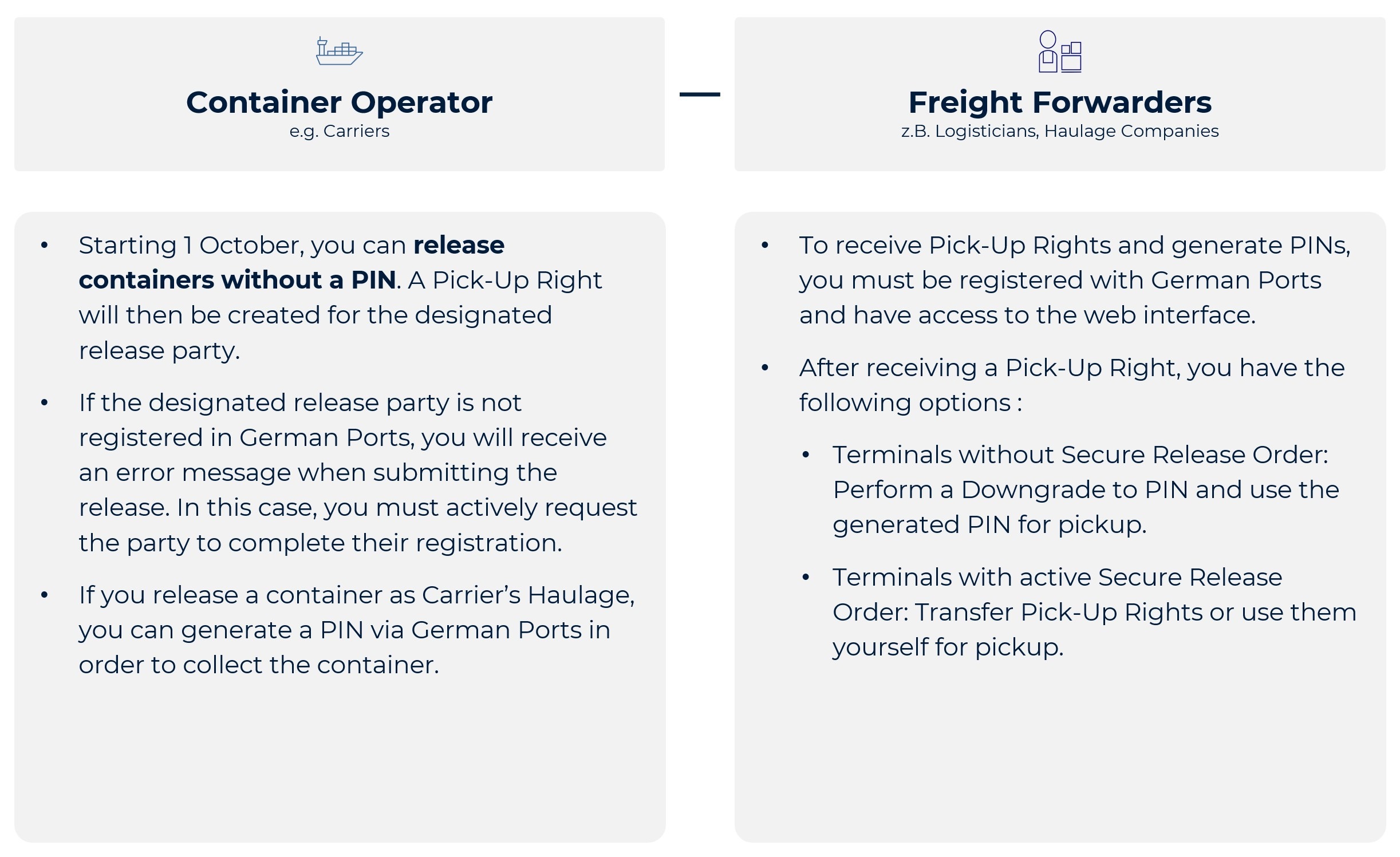 On 1 October 2025, the Secure Release Order process will be launched with the shipowners. For all other process participants, a "downgrade to PIN" will remain possible for a transitional period so that the PIN-based process can continue to be used.